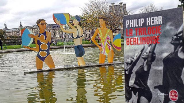 J’ai une histoire particulière avec Philip Kerr, et plus particulièrement ce livre, découvert dans une librairie à Séville alors que j’étais coincé là-bas par l’éruption d’un volcan islandais. Une histoire assez improbable. J’ai longtemps cru que je n’arriverais jamais à en parler ici, et était même prêt à l’illustrer avec une photo de trois verres de bière berlinoise. Et puis le week-end dernier, la FIAC hors les murs m’a offert une opportunité en or, que j’ai immédiatement saisie. « La trilogie berlinoise » regroupe trois enquêtes de Bernie Gunther, commissaire de police puis détective privé sous le IIIe Reich allemand et après la fin de la guerre. Que ce soit pour retrouver les assassins de riches industriels, enquêter sur un chantage exercé à l’encontre d’un homosexuel, arrêter un tueur en série ou tenter d’innocenter un ancien policier, Bernie devra naviguer en eaux troubles, entre truand, SS, Gestapo et militaires.