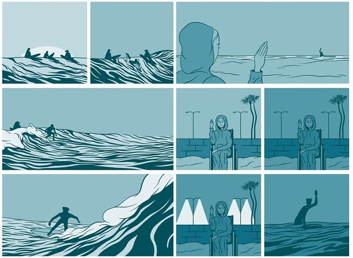 « In Waves » est un récit autobiographique qui nous raconte la relation de l’auteur avec Kirsten. Peu avant son décès, il lui promet de dessiner leur histoire d’amour. Si elle s’inscrit dans les flots et sur une planche de surf, leur passion commune, elle connaîtra aussi la maladie et les hôpitaux.