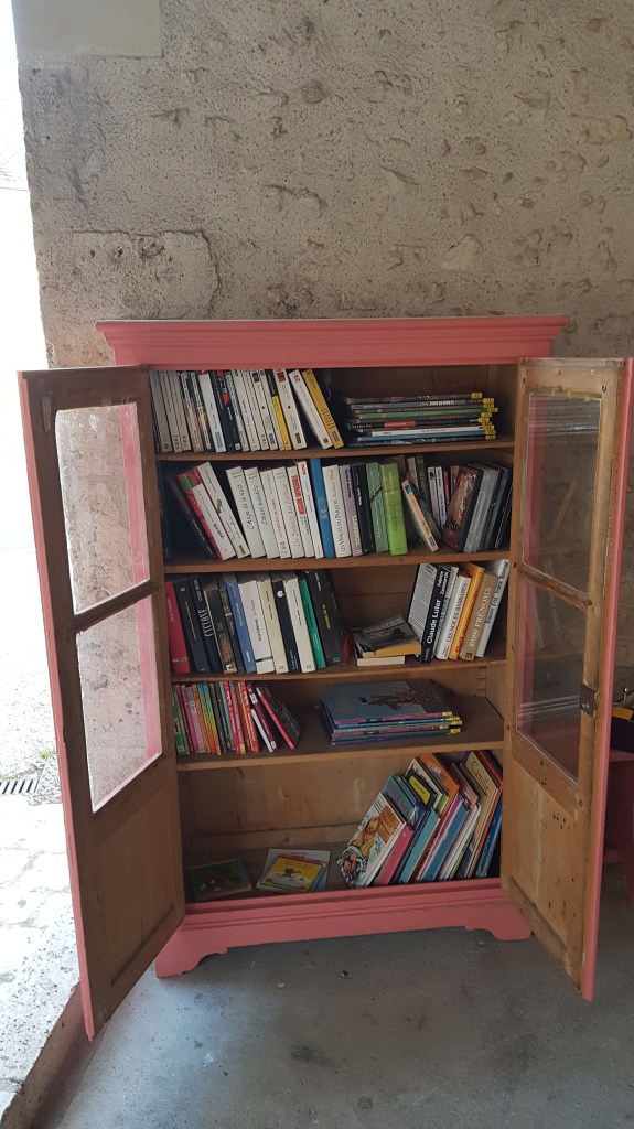 Depuis, il y a eu beaucoup de changements puisqu’une jolie petite étagère est venue remplacer la première version de la boîte à livres. Et ce village est devenu notre nouveau chez nous. Du coup nous en profitons pour faire vivre au maximum cette boîte dans laquelle nous faisons toujours de jolies découvertes (disques de l’armée rouge et livres de Julien Lepers y compris !)