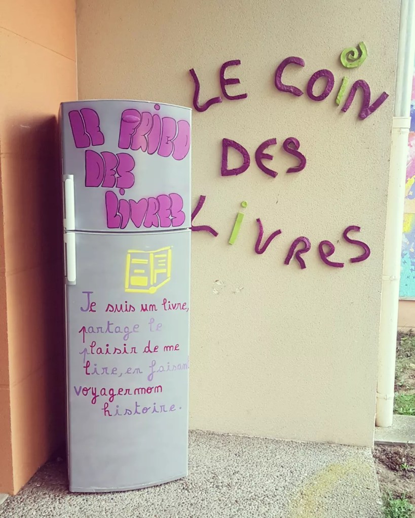 Aujourd’hui je vous présente un nouveau frigo à livres, situé pas très loin de chez moi, à Vineuil dans le Loir et Cher. Avec en plus une petite bibliothèque pour les livres jeunesse juste à côté, il y a vraiment tout ce qu’il faut pour être heureux !
