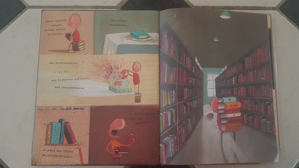 L’album nous fait faire la connaissance d’Henri. Il s’agit d’un garçon comme beaucoup d’autres, qui adore lire. Sa particularité serait plutôt dans son mode de consommation des livres puisqu’il adore les manger ! Et plus il en avale, et plus son intelligence se développe. Mais bientôt, les choses commencent à se gâter et Henri va devoir trouver une nouvelle manière de les consommer.