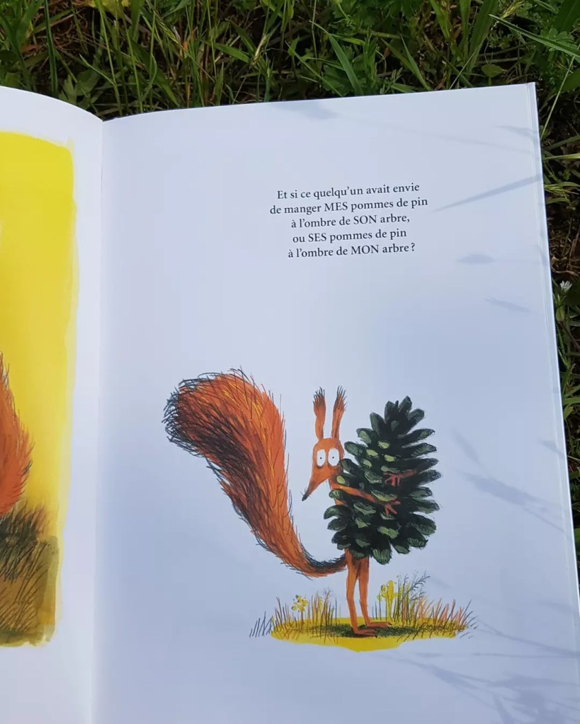 « C’est mon arbre » est un album très drôle qui nous raconte l’histoire d’un écureuil qui va s’approprier un arbre et ses pommes de pin et tout faire pour défendre sa propriété, sans se rendre compte qu’il est tout seul. Une fois de plus, le talent d’Olivier Tallec fait ses preuves avec des dessins superbes, notamment un écureuil terriblement expressif. Entre humour et sagesse, il aborde en filigrane les thèmes de l’envie et la jalousie. À trop chercher à tout garder pour lui, l’écureuil en oublie l’essentiel. Un album parfait pour apprendre aux petits les joies du partage !