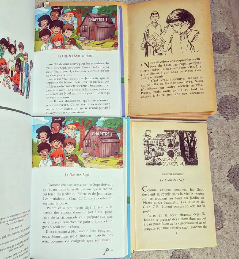 J’adorais le Clan des 7 (et aussi le Club des 5 et Les 6 compagnons) quand j’étais petite. J’avais entendu dire que les nouvelles versions avaient été simplifiées. Je ne pensais pas autant. Le vocabulaire trop daté que je comprends, mais pourquoi changer le temps.