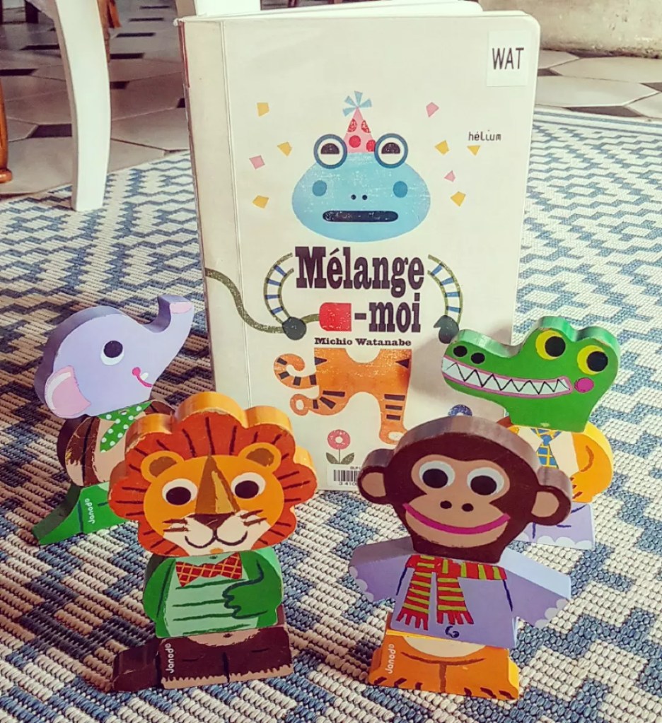 « Melange-moi » est un album très ludique qui permet aux enfants de composer leurs propres histoires. A l’aide des trois volets, ils peuvent sélectionner parmi les différentes têtes, corps et jambes proposées pour laisser parler leur imagination. Chaque partie étant composée d’un fragment de phrase, on se retrouve avec des combinaisons très rigolotes qui plaisent beaucoup aux enfants, comme sur ma deuxième image.
