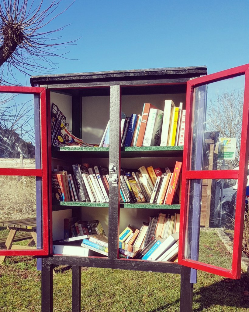 Une boîte bien pleine mais pas forcément très bien rangée jusqu’à mon passage. En général, je ne peux pas m’empêcher de remettre de l’ordre dans les boîtes à livres que je trouve ! 😊