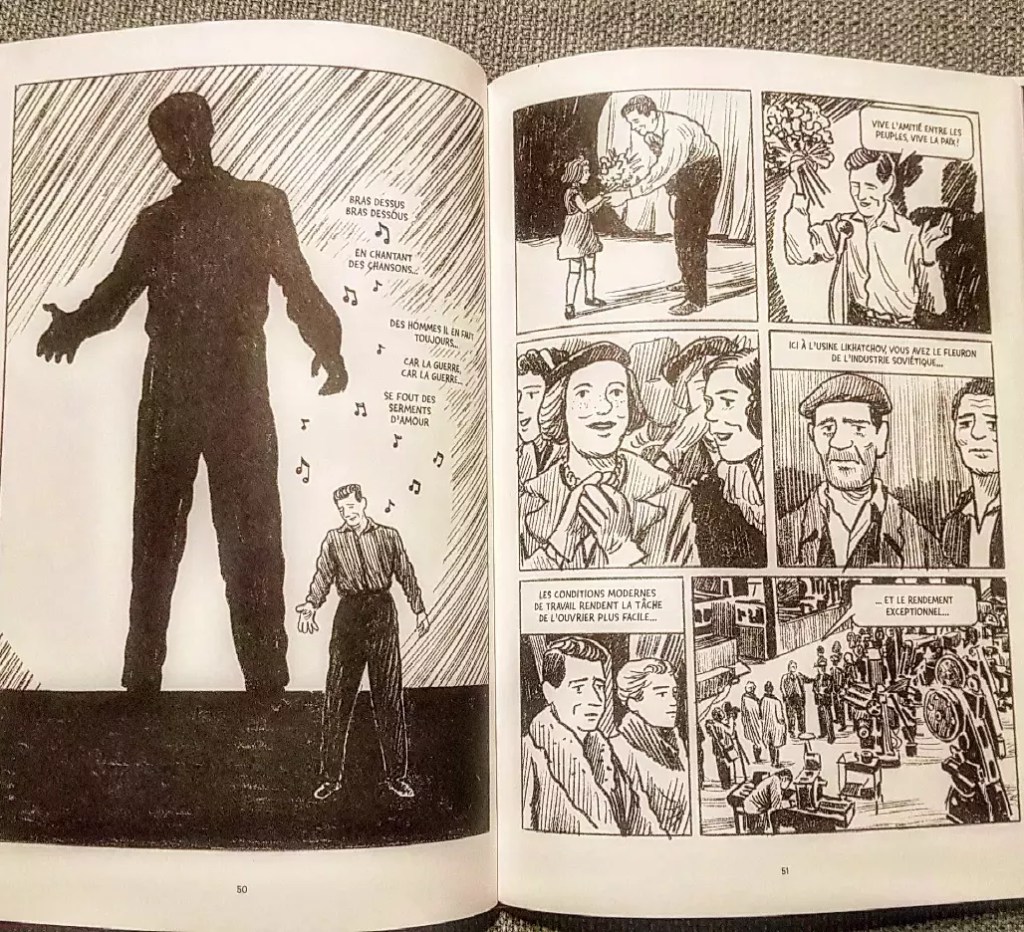 La bande-dessinée nous immerge au cœur du couple avant et pendant cette tournée. Elle retranscrit très bien leurs états d’âme, pris entre les mensonges du pouvoir soviétique, la révolte occidentale faisant écho aux massacres de Prague et leur foi dans un communisme qu’ils ont chevillée au corps depuis toujours. Entre prise de conscience, faux semblants et affirmation et défense de leurs convictions, c’est un exercice pour le moins délicat qui s’offre à eux. L’album nous éclaire à travers ça sur leur couple lui-même, son fonctionnement et sa capacité à se soutenir mais également à s’aiguillonner Avec l’objet en filigrane ne pas se voiler la face et rester lucide sur l’environnement qui les entoure. « Derrière le rideau » est un bel album graphiquement sans fioritures. Il est porté par des dessins en noir et blanc très épurés qui font ressortir les lignes de dialogues et semble nous renvoyer directement au cœur des années 1950.