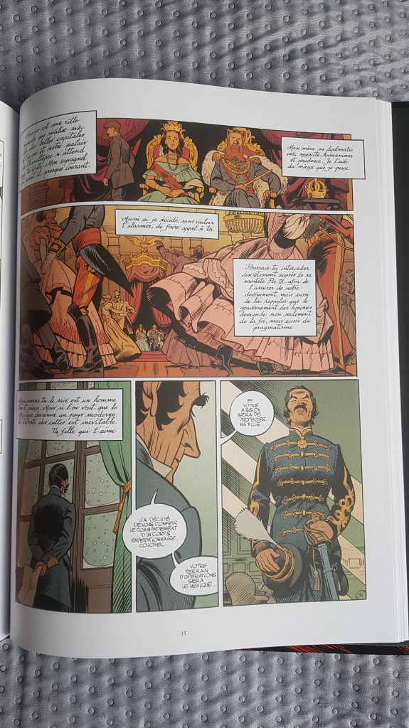 Tout au long des trois tomes (sur les quatre que comptera la série) se développe une magnifique fresque historique aux accents tragiques. Les différents personnages, en particulier Charlotte et Maximilien, sont superbement restitués avec leurs différentes facettes, forces, faiblesses, qualités et défauts. Les choix que fait Charlotte apparaissent comme une fuite en avant dont le lecteur mesure bien l’issue tragique qui s’annonce. La série parvient à très bien faire vivre la grande histoire avec cette « conquête » du Mexique et la petite histoire autour de Charlotte, sa destinée et sa relation avec Maximilien. Graphiquement, les albums sont superbes et immergent parfaitement le lecteur dans l’atmosphère de l’époque. Des collines du Mexique jusqu’aux palais impériaux en passant par les geôles et les villages traditionnels, le plaisir pour les yeux est bien là.