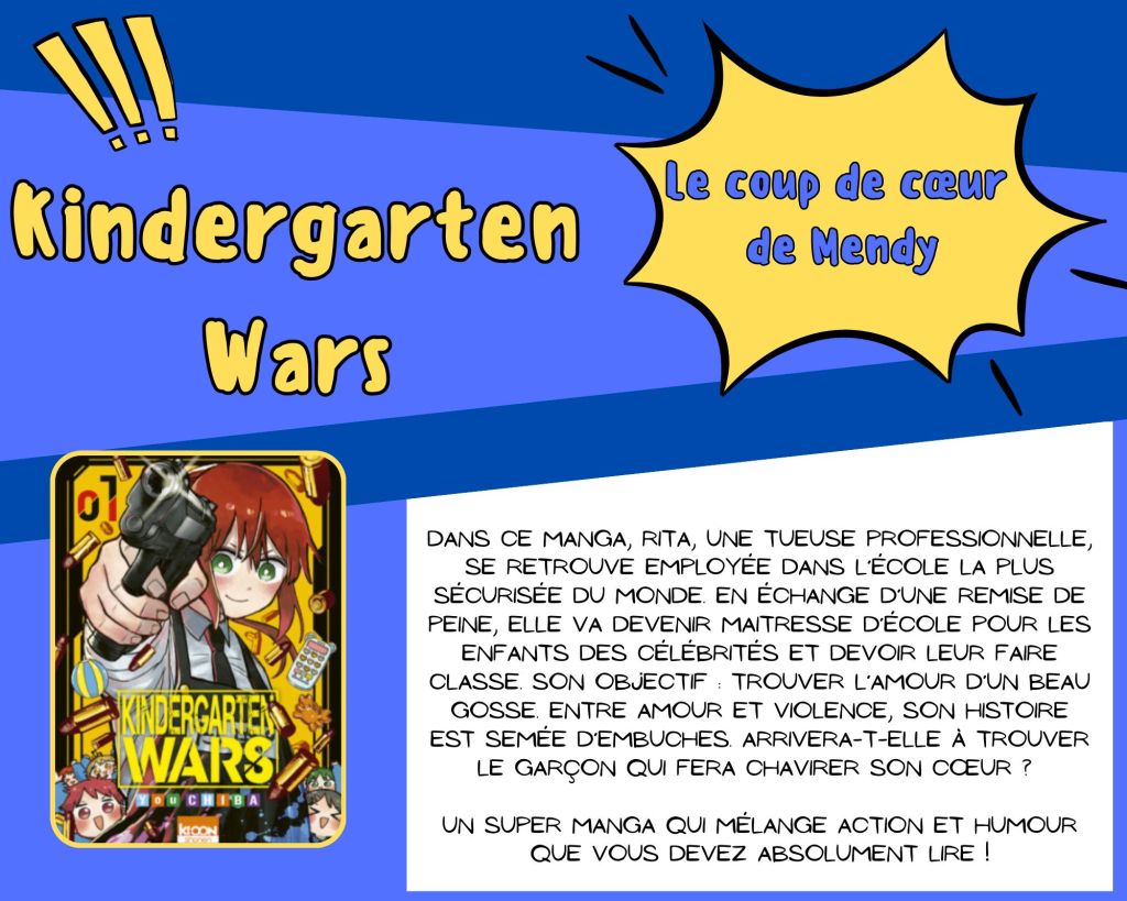 La asemaine dernière, la librairie a eu le plaisir d’accueillir Mendy en stage. Elle partage avec vous son dernier coup de cœur pour le manga « Kindergarten Wars »